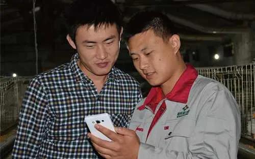 兩名養(yǎng)殖戶正在手機上操作新希望集團(tuán)推出應(yīng)用軟件(受訪者供圖)