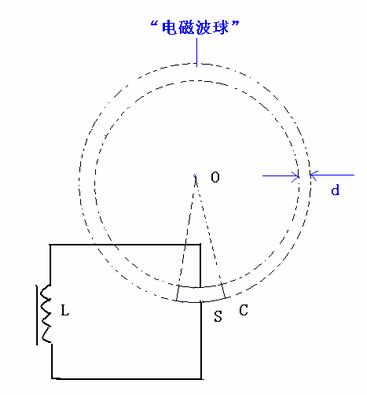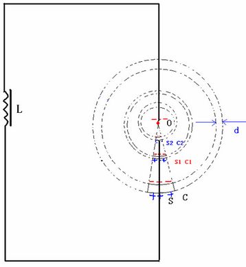 如圖7,在一個(gè)由“點(diǎn)電極”O(jiān)與“球冠電極”S組成的“球錐空間”中,如果O與S之間產(chǎn)生了足夠的“特高電壓”,那么這個(gè)“球錐空間”就可以被“雙向激擊”,依次連續(xù)發(fā)生“球冠振蕩”……、S2、……、S1、……、S,產(chǎn)生不同頻率的“電磁波球”,并且呈“嵌套球狀”分布,由外到里即由球冠S到點(diǎn)O,產(chǎn)生的“電磁波”的頻率越來(lái)越大。