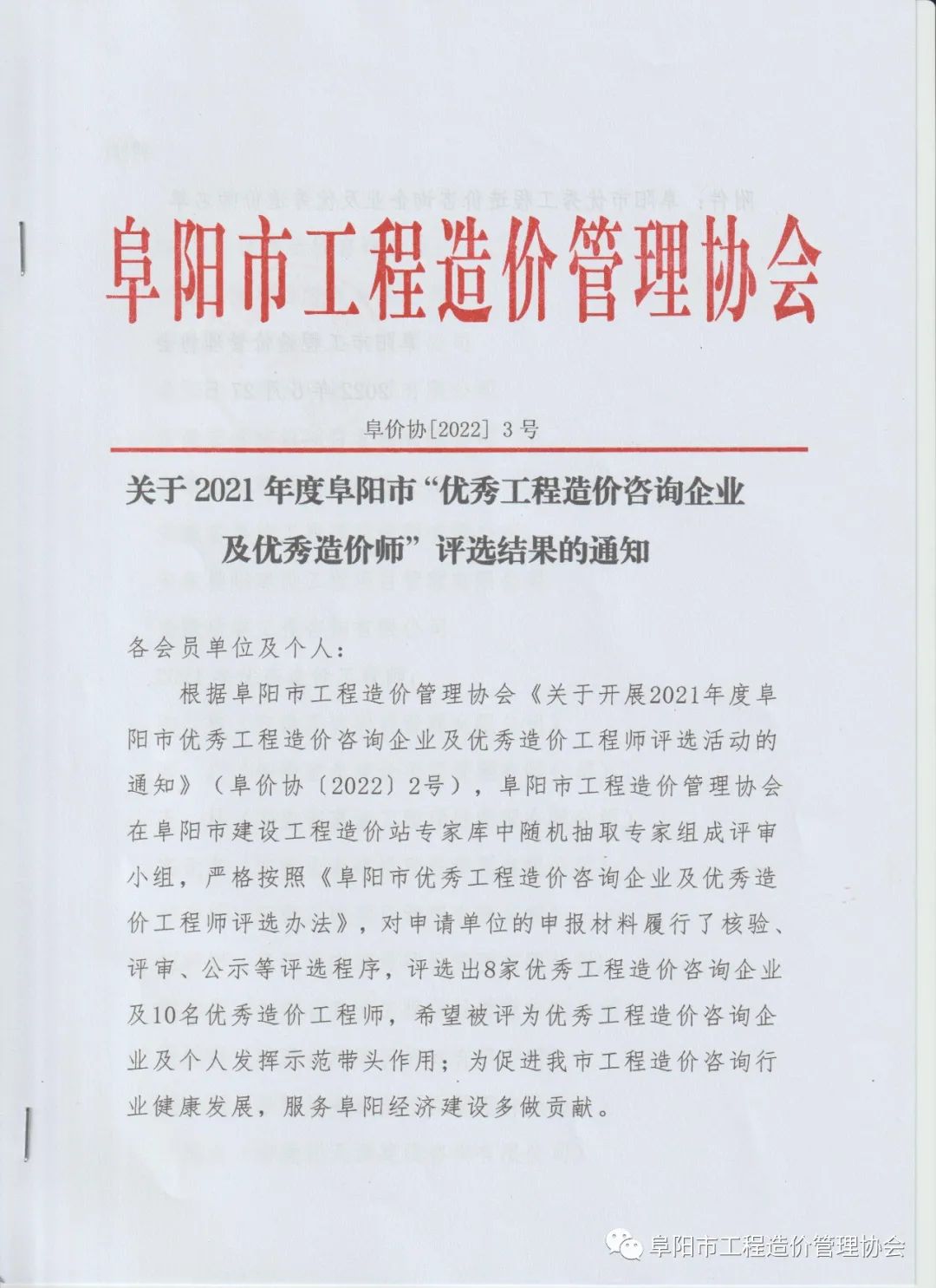 關(guān)于2021年度阜陽市“優(yōu)秀工程造價(jià)咨詢企業(yè)及優(yōu)秀造價(jià)師”評(píng)選結(jié)果的通知