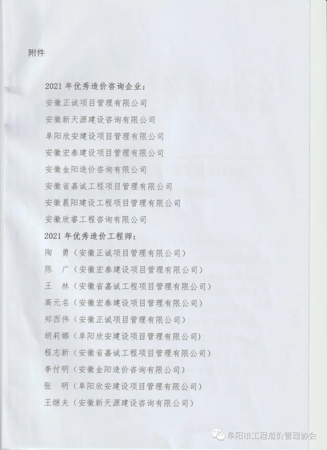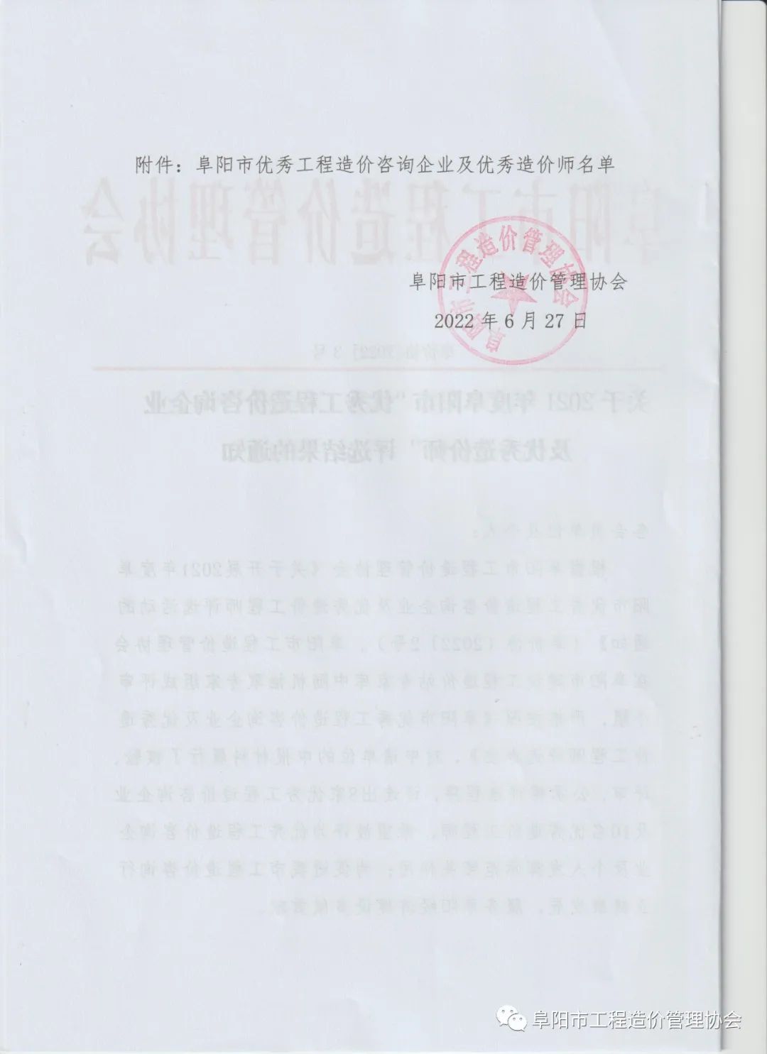 - 關(guān)于2021年度阜陽市“優(yōu)秀工程造價(jià)咨詢企業(yè)及優(yōu)秀造價(jià)師”評(píng)選結(jié)果的通知