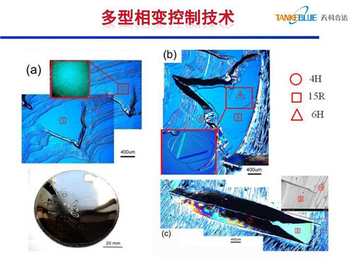 碳化硅晶體生長(zhǎng)時(shí)如果臺(tái)階過寬,晶型沿 [0001] 方向的排列信息反應(yīng)不出來,會(huì)在臺(tái)階上自發(fā)成核,發(fā)生晶型轉(zhuǎn)變。研究發(fā)現(xiàn),當(dāng)晶體表面不光滑、不平整時(shí),易發(fā)生多型相變,4H會(huì)發(fā)生6H和15R相變。另一方面晶型轉(zhuǎn)變與生長(zhǎng)室氣氛相關(guān),通過控制生長(zhǎng)室氣氛解決了多型相變技術(shù)。