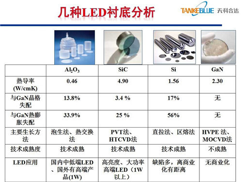 但是在這里面我們今天講的主要是藍(lán)寶石、碳化硅,剛才在講的時(shí)候我思考幾個(gè)問題,這幾個(gè)材料在發(fā)光效率上藍(lán)寶石可以做到150lm/W,碳化硅可以做到200lm/W,在發(fā)光效率上確實(shí)體現(xiàn)差異。在物理基礎(chǔ)參數(shù)上體現(xiàn)了差異,比如說跟氮化鎵外延,從晶格匹配上,碳化硅上長(zhǎng)氮化鎵確實(shí)好一些,藍(lán)寶石失配大一些,直接影響外延的質(zhì)量。另外導(dǎo)電性、熱導(dǎo)率也是有差異的。