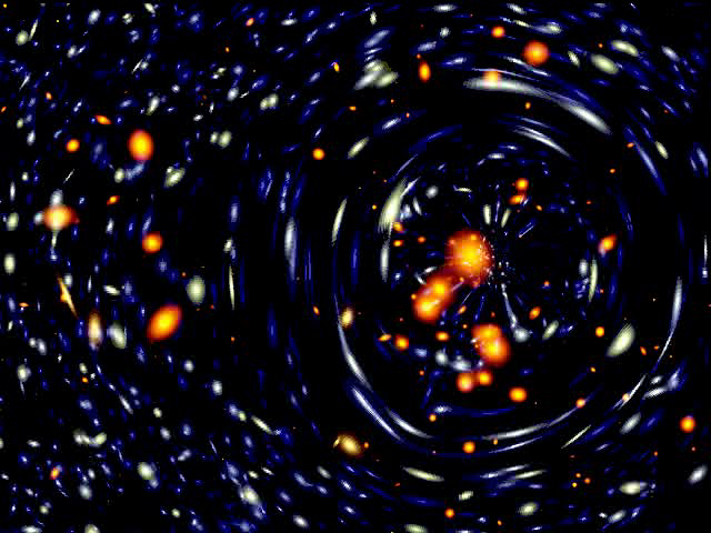 根據(jù)愛因斯坦的理論,質(zhì)量使得時空彎曲,光線沿著時空中最短路徑行進。因此恒星在天空中真實的位置與視線延伸有偏轉(zhuǎn)。這就是引力透鏡現(xiàn)象。1919年5月29日著名的愛丁頓團隊日全食觀測,驗證了愛因斯坦光線偏轉(zhuǎn)(太陽在明亮的畢星團前,使得恒星的位置偏離夜間觀測位置)。由于暗物質(zhì)雖然看不見,但是也有引力作用,因此這一觀測方法可以應(yīng)用到大尺度宇宙學(xué),用來觀測引力透鏡現(xiàn)象的前景物質(zhì),即大質(zhì)量天體(包括暗物質(zhì))。