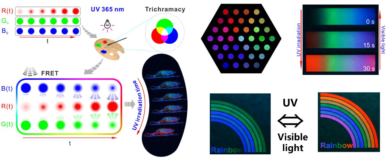 比如發(fā)光的防偽材料,利用纖維素均相可控反應(yīng)的優(yōu)勢,把原來容易聚在一起的熒光分子,通過化學(xué)方法鍵合到纖維素上,克服了溶液狀態(tài)下聚集誘導(dǎo)淬滅效應(yīng),將其制成固態(tài)熒光材料,同時它仍然具有高分子的可打印、可噴涂的特點,將不同的發(fā)光基團接到不同的纖維素上可以得到不同的顏色,將紅、綠和藍三種顏色的纖維素衍生物共混,利用三基色原理,還可以做打印的動態(tài)熒光材料(圖5)。